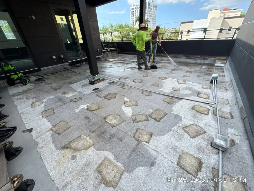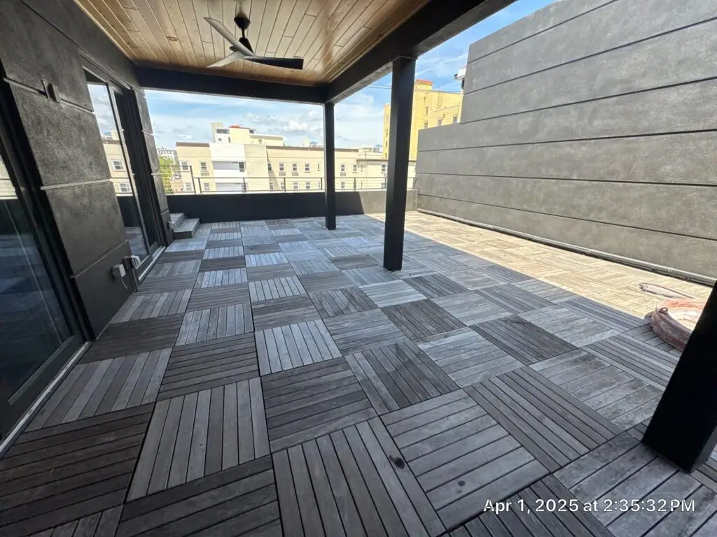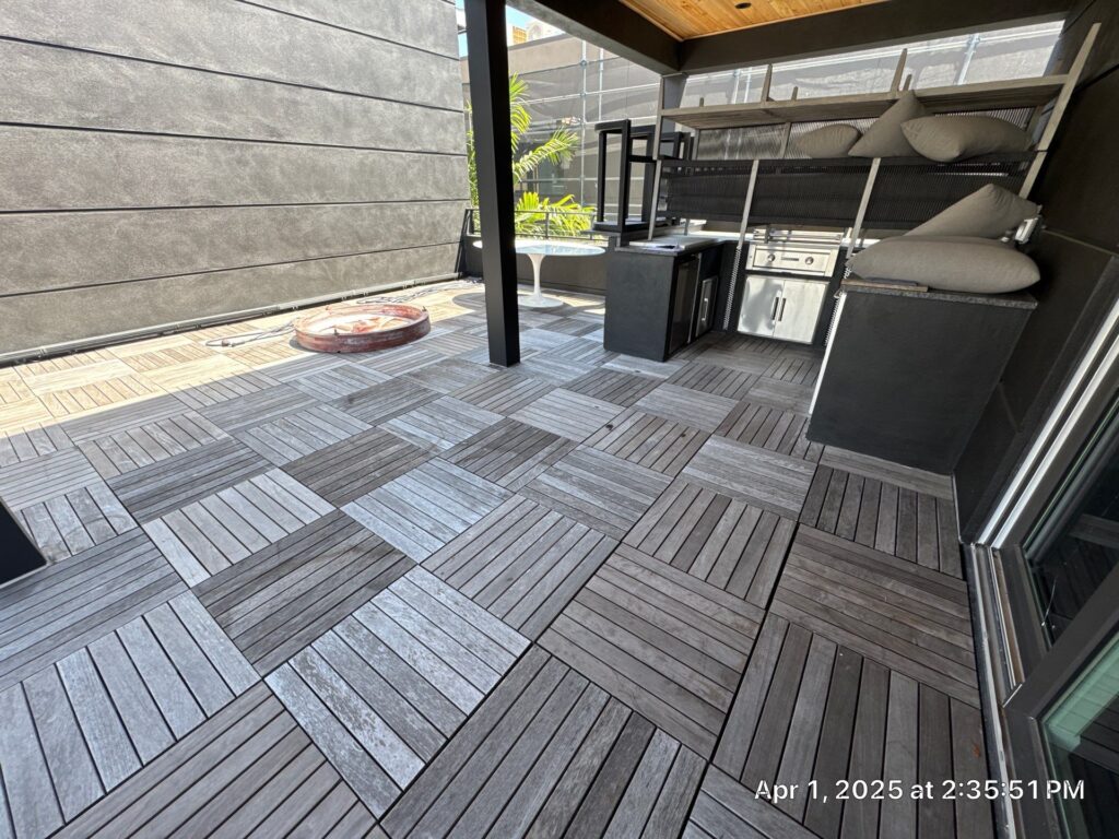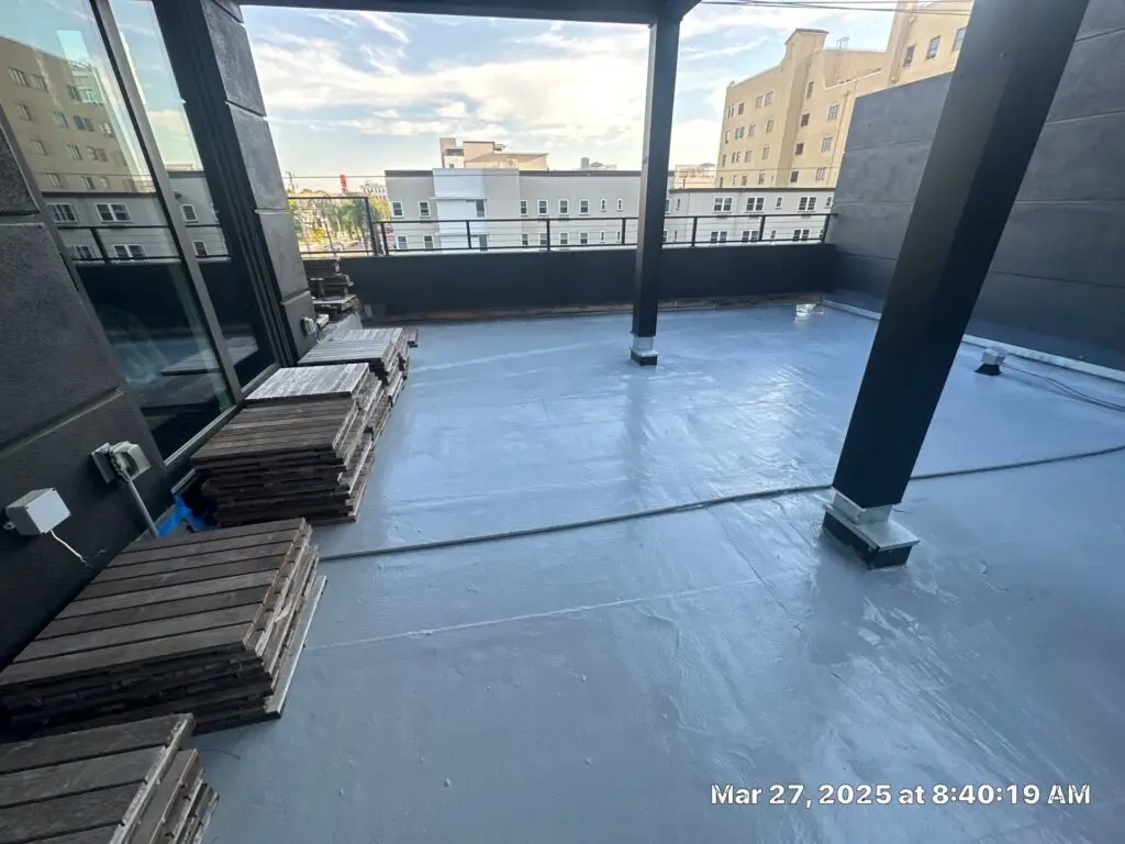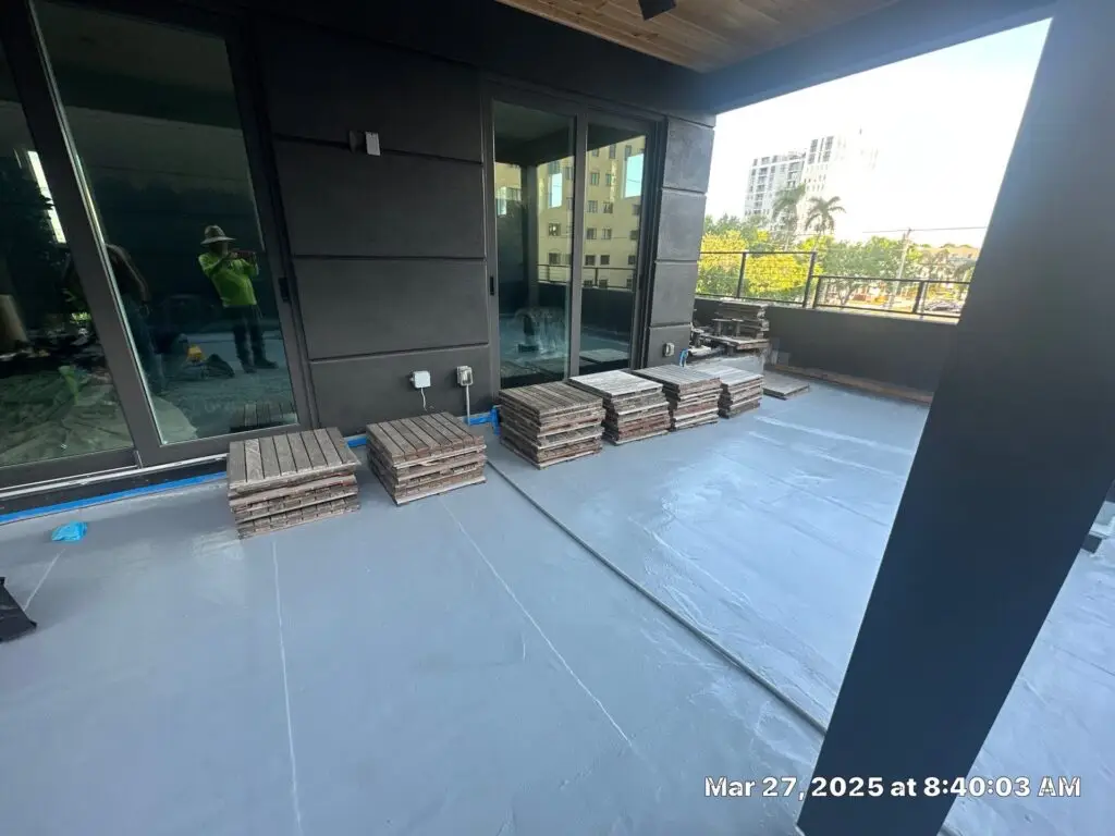 This project began with the careful removal of an existing paver deck system. These materials were not discarded but carefully lifted, cataloged, and set aside for reinstallation. With the surface cleared we prepared the balcony substrate using a high-performance fluid-applied traffic coating system. Once the protective coating cured, RoofSmith professionals began reinstalling the original wood pavers with precision. The result? A stunning, elevated outdoor space that blends the natural beauty of wood with the robust protection of modern waterproofing technology.